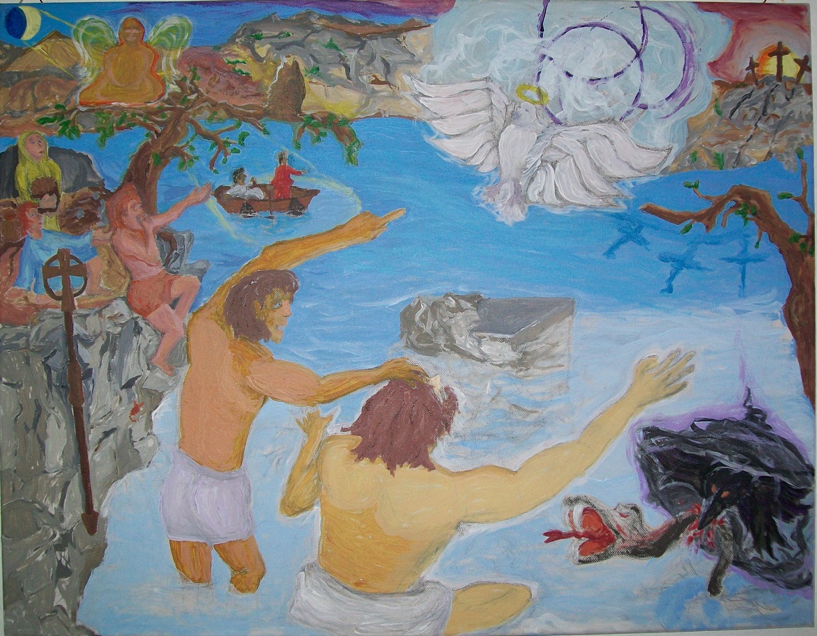 Die Jordantaufe zum ersten Freien Maurer … ein Gemälde – a. k. a. ‚das Geheimnis des Bösen (und der Materie)‘; bzw. das Mysterium der ‚Mütterlichen Substanz Gottes‘, die durch die Taufe/Reinigung ihre ‚Väterliche Form Gottes‘ erhält)‘ == die ‚Jungfrau Sophia‘ (i.e. die ‚vollends geläuterte MATER[ia] DEI‘ / der ‚durchsichtig gewordene Schleier der MAYA/MAriA‘ um den einzelnen Menschen(‚-sohn‘) herum / das ‚(immanente) Wirken des ewigen (transzendenten) Gesetzes des Kosmos‘ / ‚Ruach Elohim‘ / ‚Geist/Seele Gottes‘ / ‚Heiliger Geist‘ des römisch-katholischen Trinitäts-Dogmas) befruchtet vom ‚Heiligen Geist‘ (i.e. das ‚in der Umwelt erkennbare Geistige, das als gänzlich vom erkennenden Individuum selbst ausgehend erkannt wird‘ / der ‚Vatergott‘ des römisch-katholischen Trinitäts-Dogmas / das ‚ewige Gesetz dieser Welt, das alle Erscheinungen bestimmt und bewirkt‘) führt zur Geburt des ‚Gottessohnes‘ in einem Erdenmenschenleib, dessen historischer Name eben für uns heutige Erdenmenschen ‚Jesus Christus‘ (in einer seiner verschieden-sprachigen Varianten) ist; 1 Seite